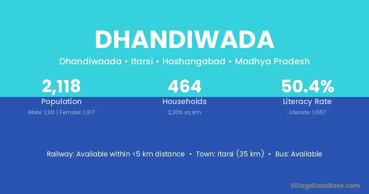 Itarsi (35 km) is the nearest town to Dhandiwada village for major economic activities and is located approximately 35 km away.