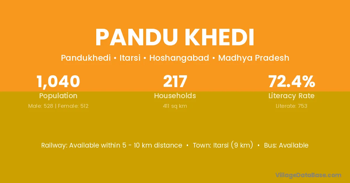 Itarsi (9 km) is the nearest town to Pandu Khedi village for major economic activities and is located approximately 9 km away.