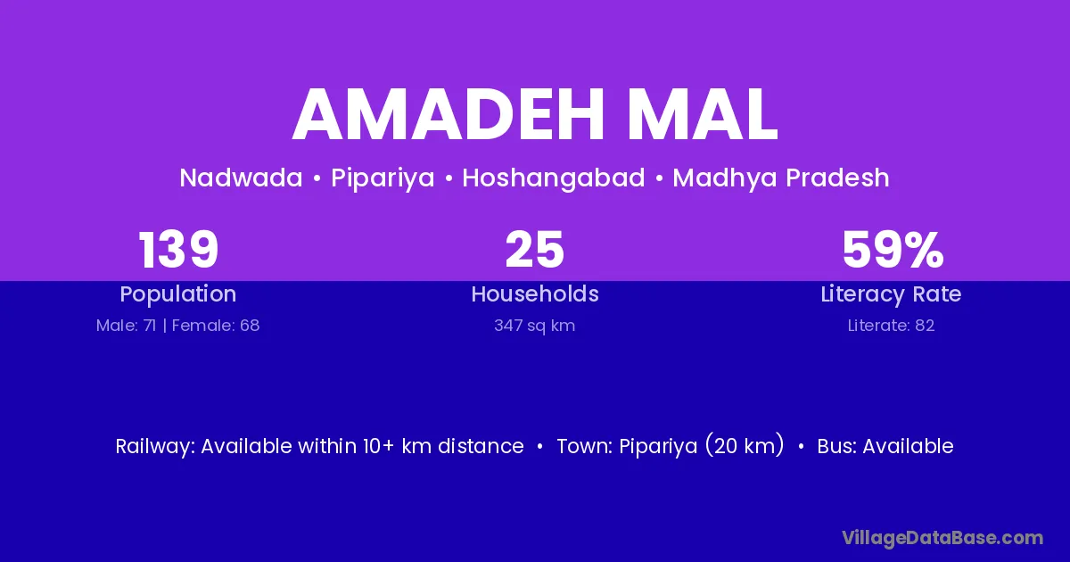 Pipariya (20 km) is the nearest town to Amadeh Mal village for major economic activities and is located approximately 20 km away.