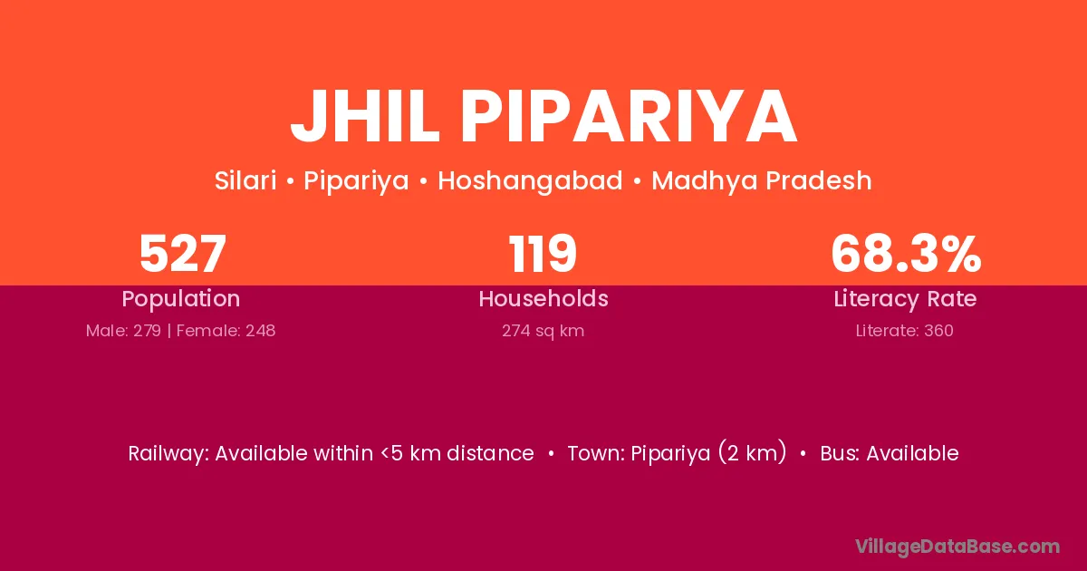 Jhil Pipariya village has a total population of 527 people, of which 279 are males and 248 are females.