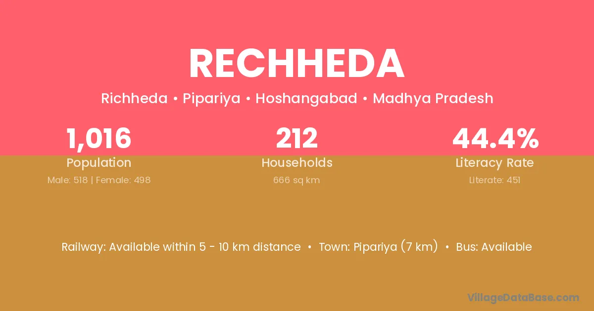 Pipariya (7 km) is the nearest town to Rechheda village for major economic activities and is located approximately 7 km away.