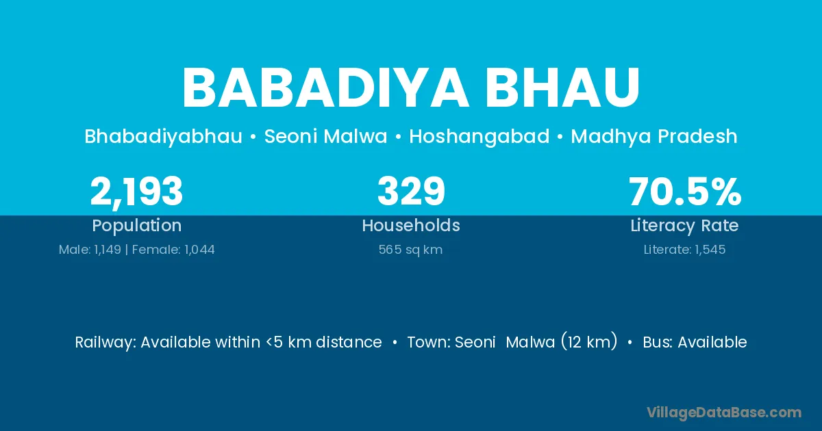 Seoni Malwa (12 km) is the nearest town to Babadiya Bhau village for major economic activities and is located approximately 12 km away.