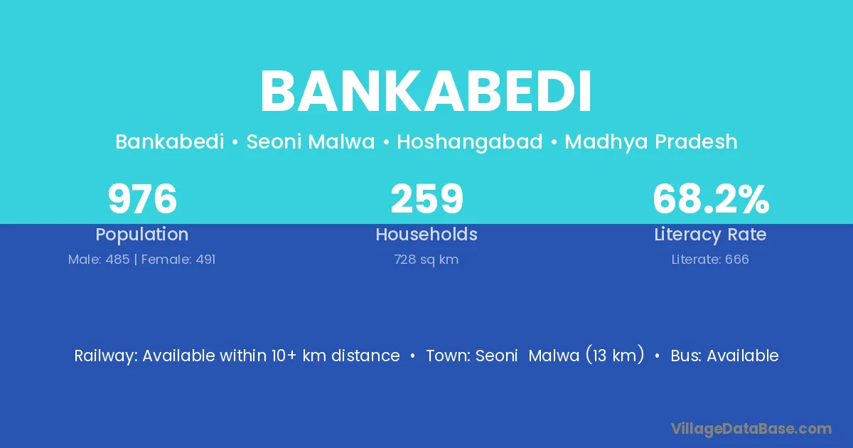 Seoni Malwa (13 km) is the nearest town to Bankabedi village for major economic activities and is located approximately 13 km away.