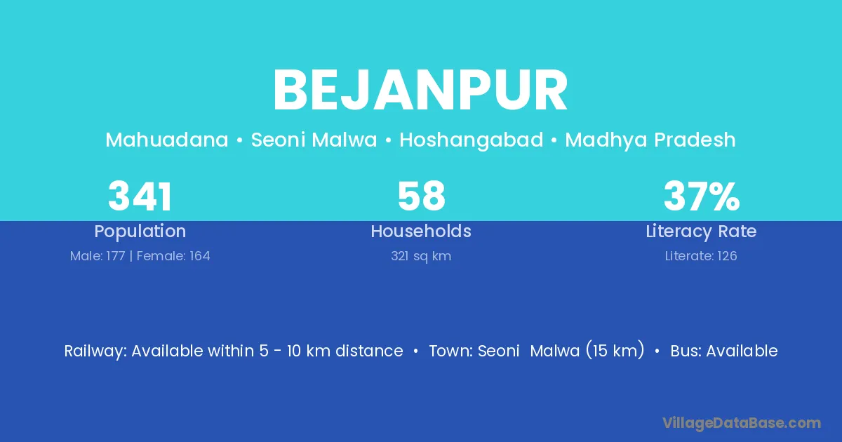 Seoni Malwa (15 km) is the nearest town to Bejanpur village for major economic activities and is located approximately 15 km away.
