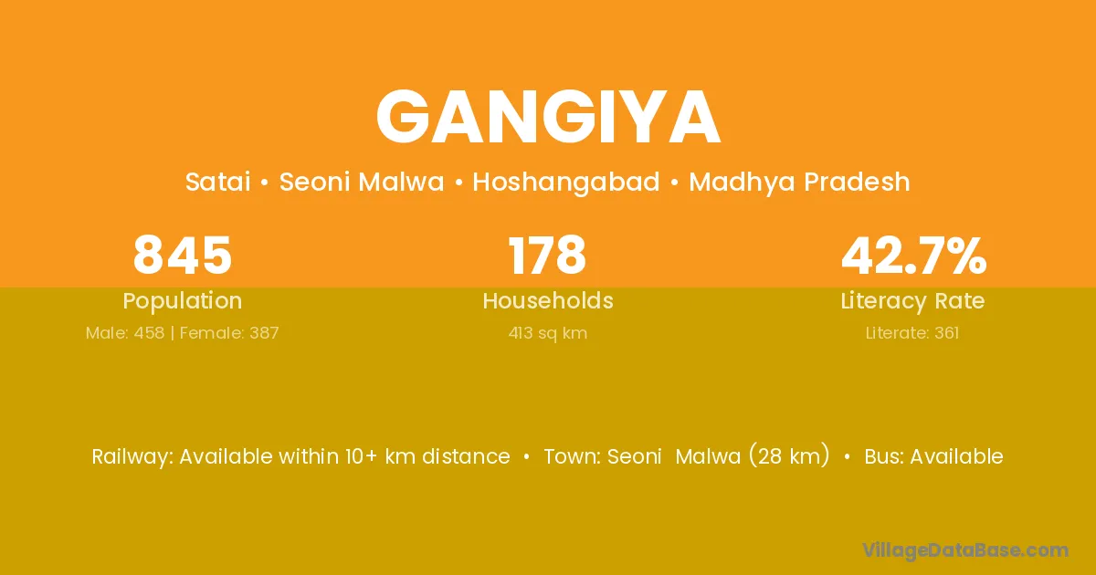 Seoni Malwa (28 km) is the nearest town to Gangiya village for major economic activities and is located approximately 28 km away.