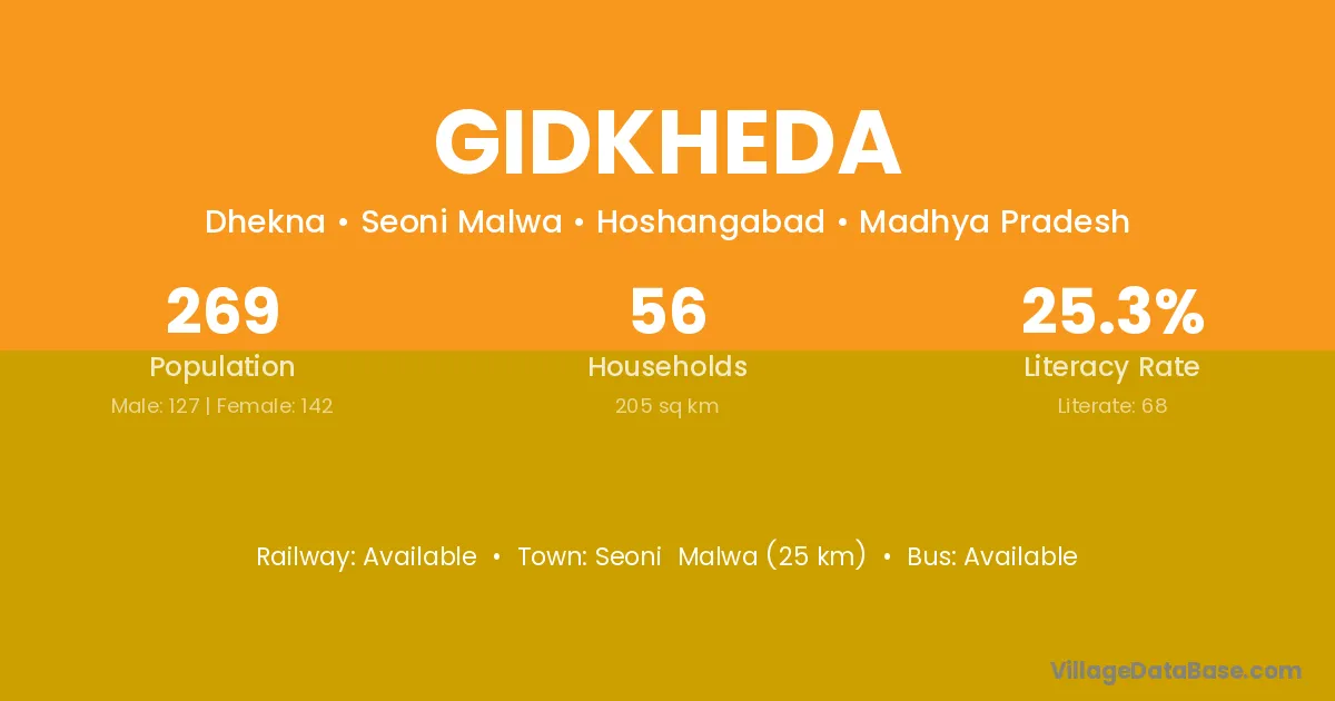 Seoni Malwa (25 km) is the nearest town to Gidkheda village for major economic activities and is located approximately 25 km away.
