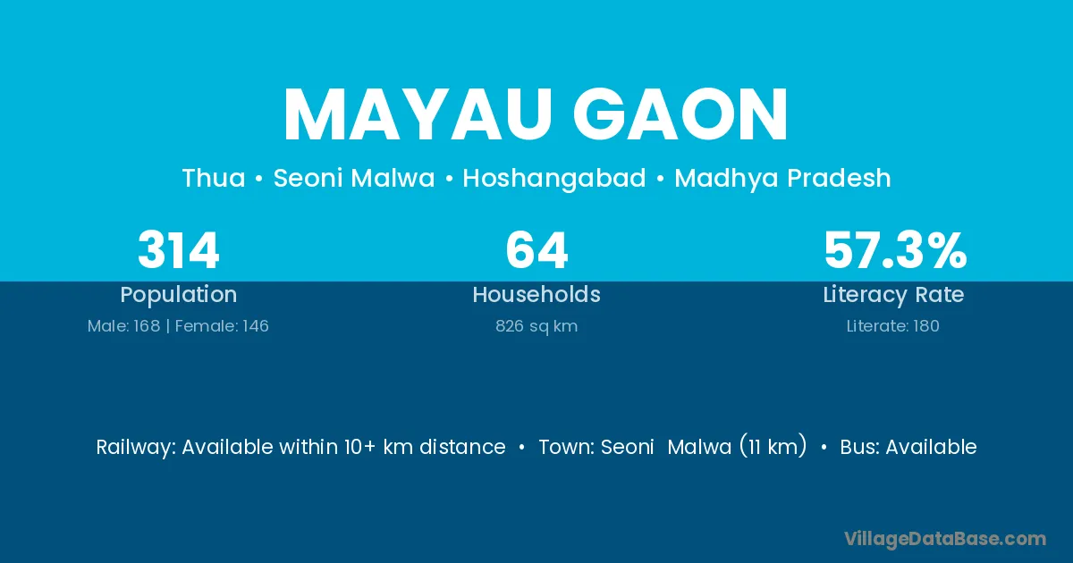 Seoni Malwa (11 km) is the nearest town to Mayau Gaon village for major economic activities and is located approximately 11 km away.