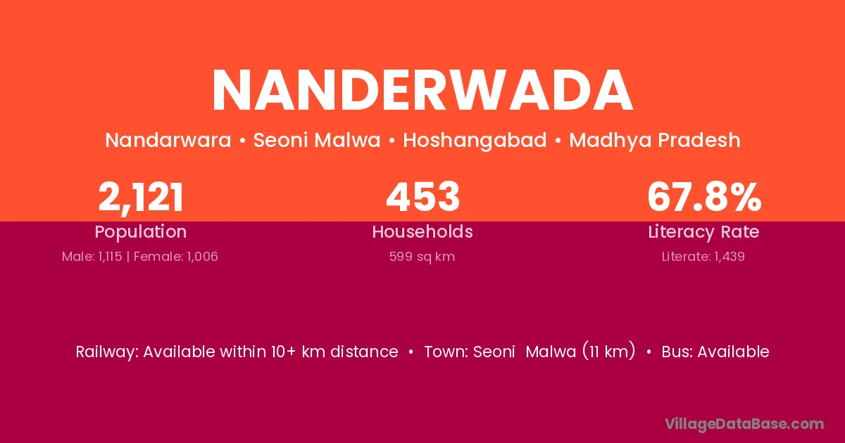Seoni Malwa (11 km) is the nearest town to Nanderwada village for major economic activities and is located approximately 11 km away.