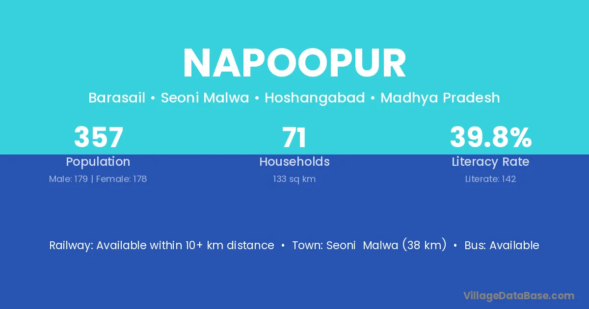 Seoni Malwa (38 km) is the nearest town to Napoopur village for major economic activities and is located approximately 38 km away.