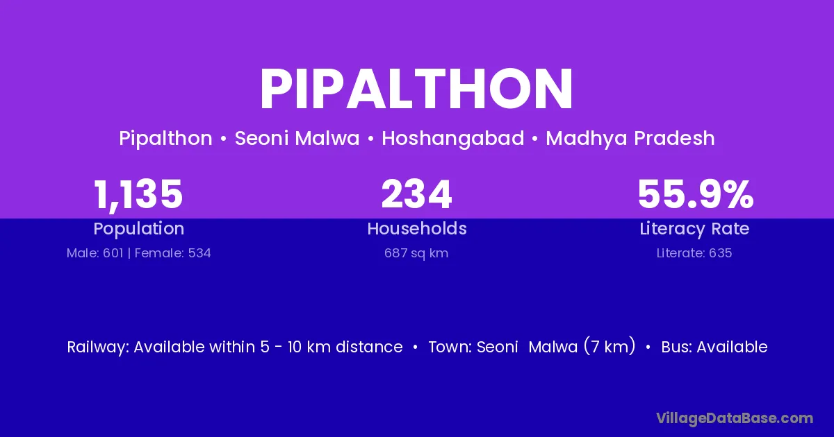 Seoni Malwa (7 km) is the nearest town to Pipalthon village for major economic activities and is located approximately 7 km away.