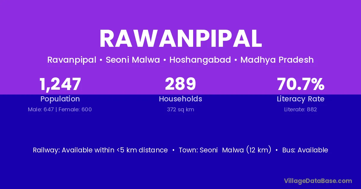 Seoni Malwa (12 km) is the nearest town to Rawanpipal village for major economic activities and is located approximately 12 km away.