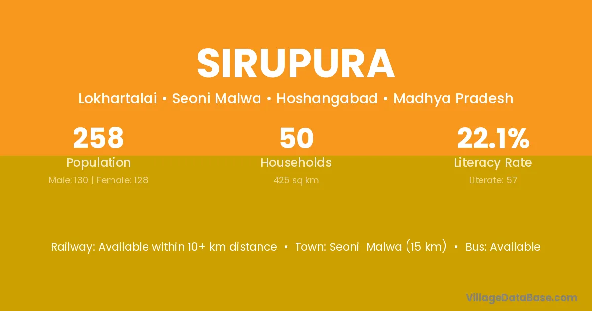 Sirupura village has a total population of 258 people, of which 130 are males and 128 are females.
