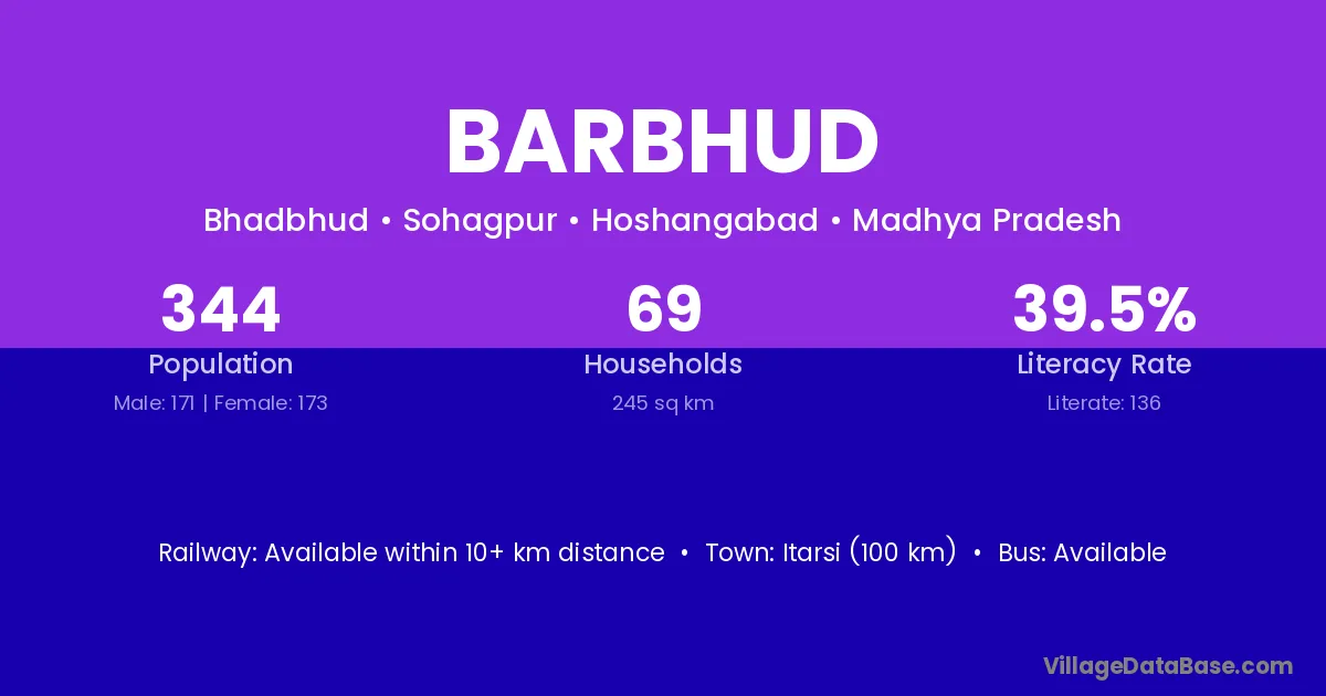 Itarsi (100 km) is the nearest town to Barbhud village for major economic activities and is located approximately 100 km away.