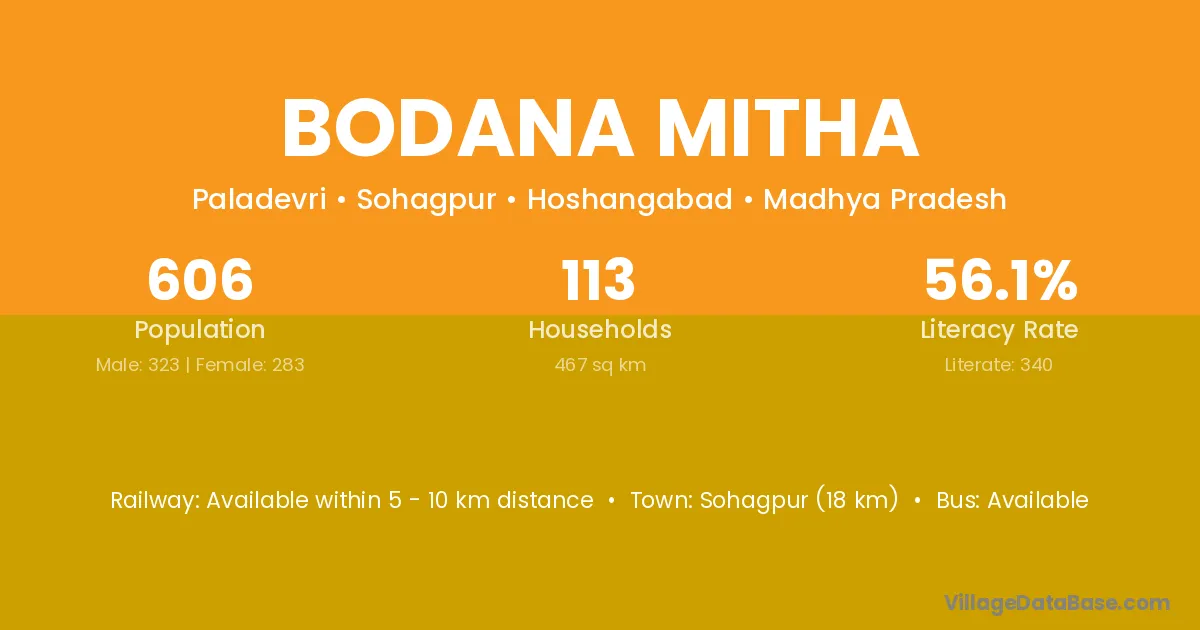 Sohagpur (18 km) is the nearest town to Bodana Mitha village for major economic activities and is located approximately 18 km away.