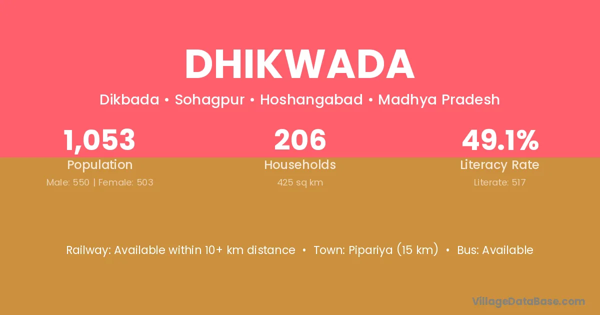 Pipariya (15 km) is the nearest town to Dhikwada village for major economic activities and is located approximately 15 km away.