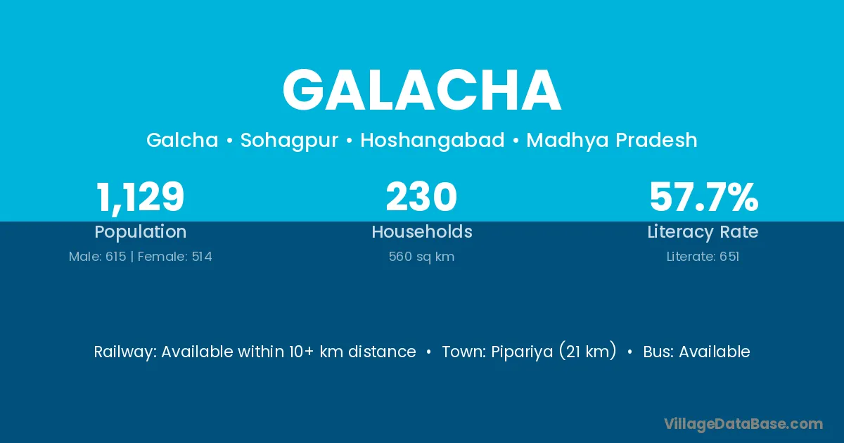 Pipariya (21 km) is the nearest town to Galacha village for major economic activities and is located approximately 21 km away.