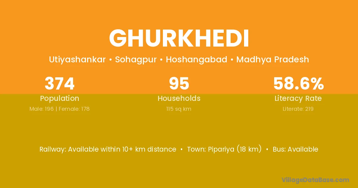 Pipariya (18 km) is the nearest town to Ghurkhedi village for major economic activities and is located approximately 18 km away.