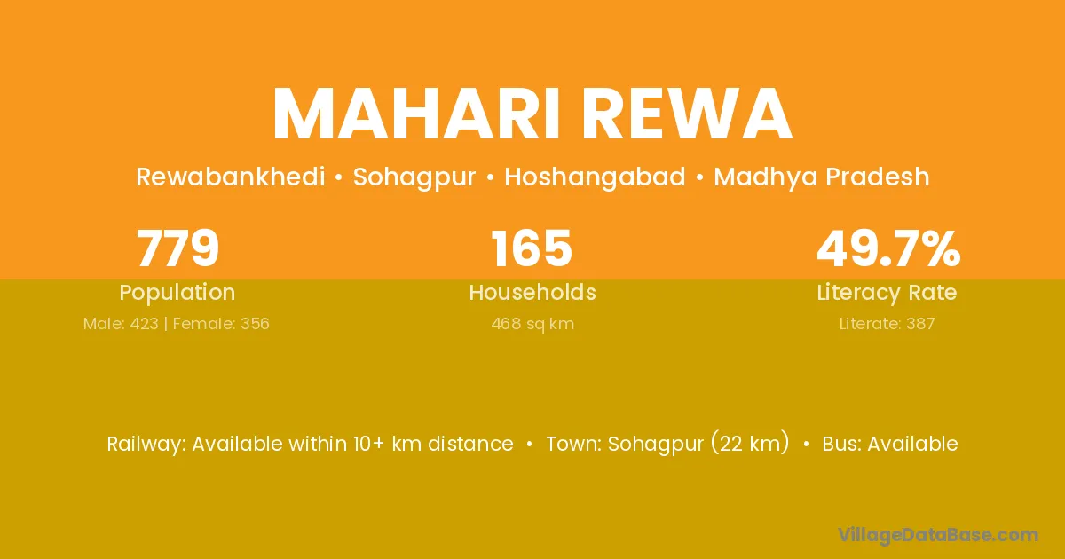 Sohagpur (22 km) is the nearest town to Mahari Rewa village for major economic activities and is located approximately 22 km away.