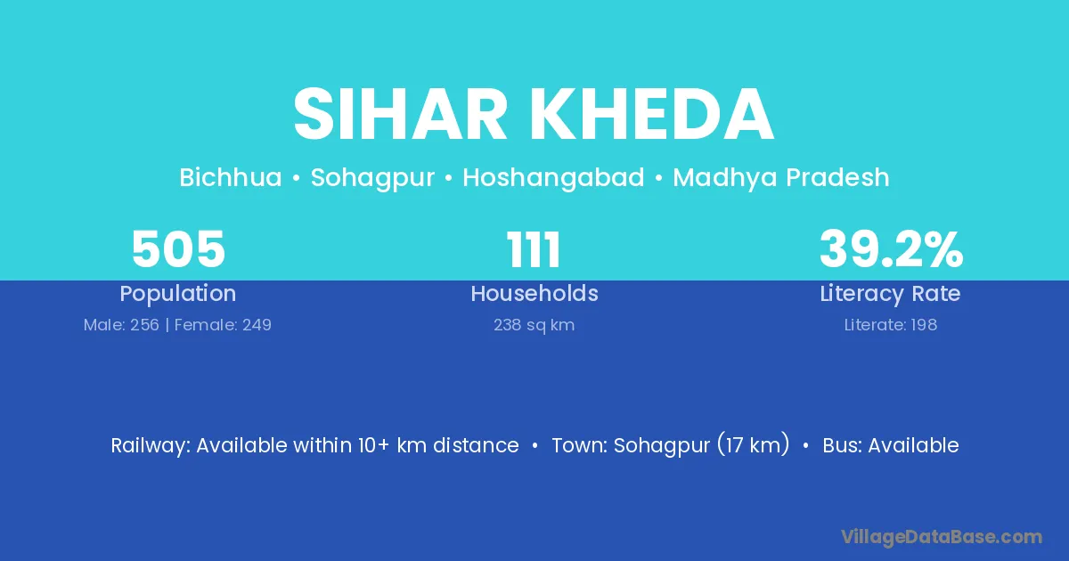 Sohagpur (17 km) is the nearest town to Sihar Kheda village for major economic activities and is located approximately 17 km away.