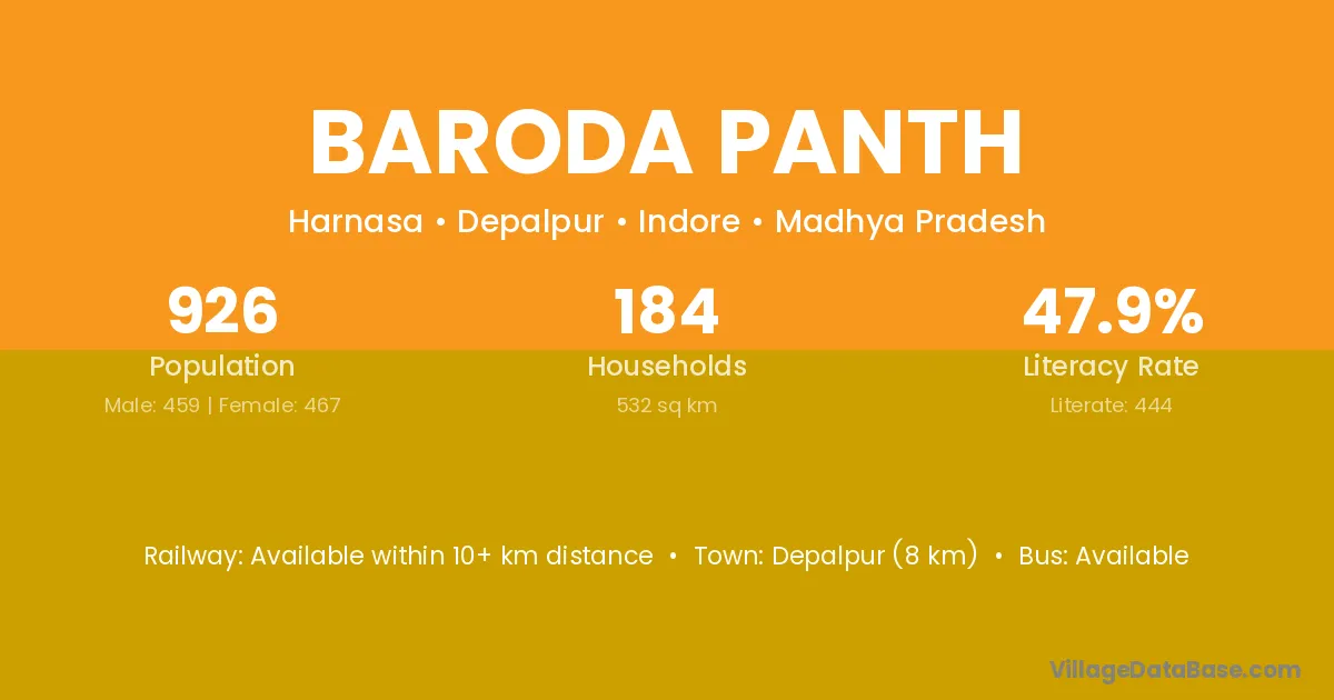 Depalpur (8 km) is the nearest town to Baroda Panth village for major economic activities and is located approximately 8 km away.
