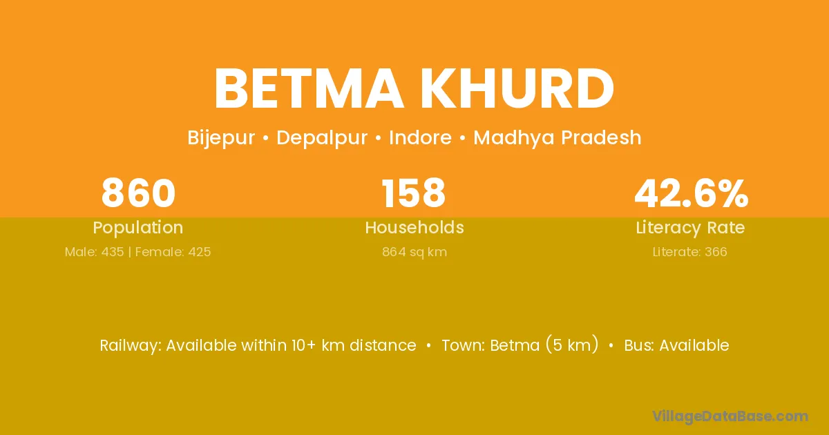 Betma Khurd village has a total population of 860 people, of which 435 are males and 425 are females.