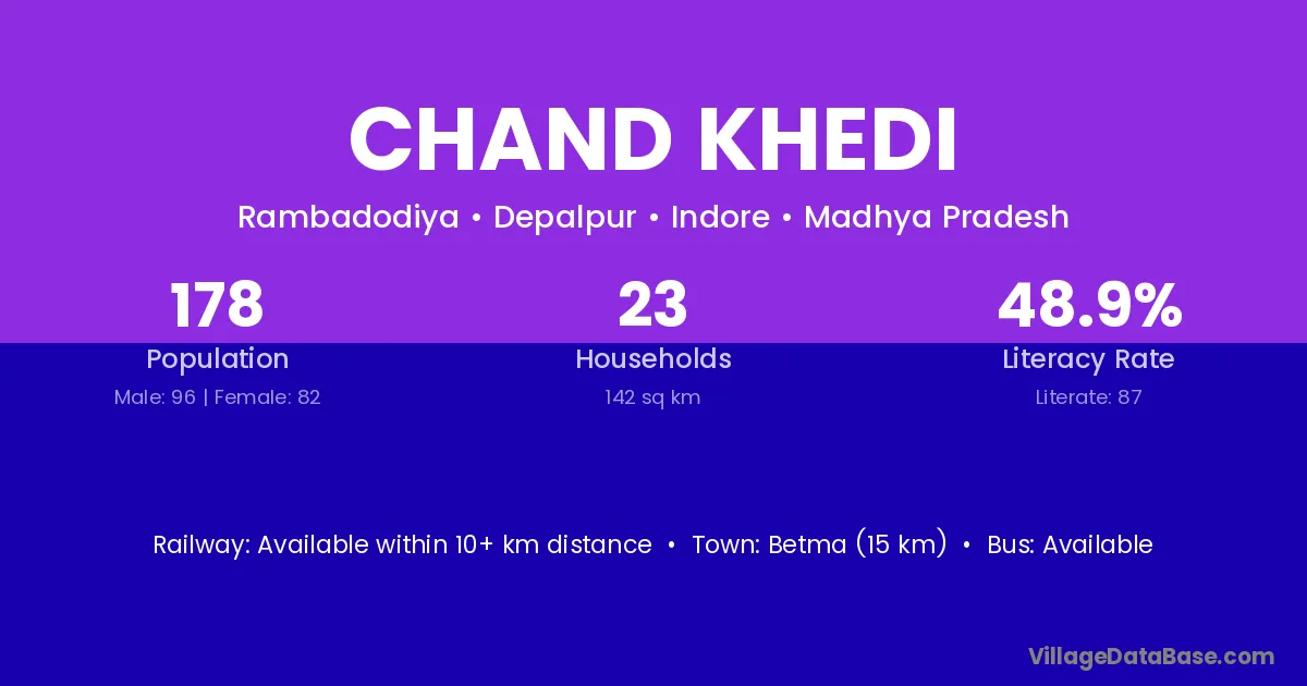 Betma (15 km) is the nearest town to Chand Khedi village for major economic activities and is located approximately 15 km away.