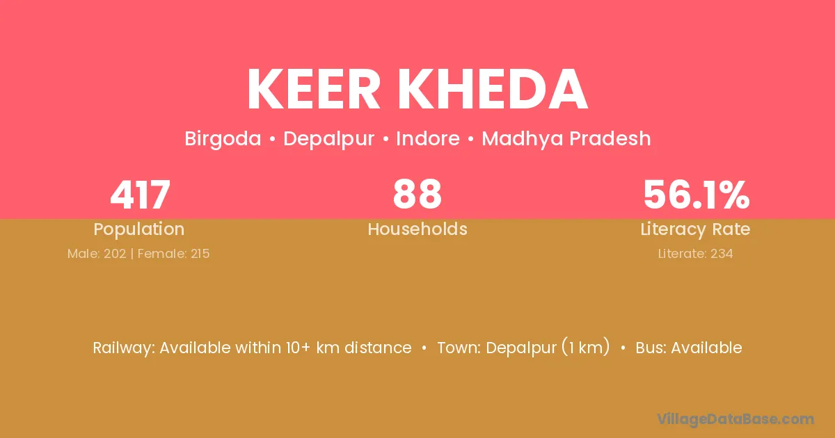 Keer Kheda village has a total population of 417 people, of which 202 are males and 215 are females.