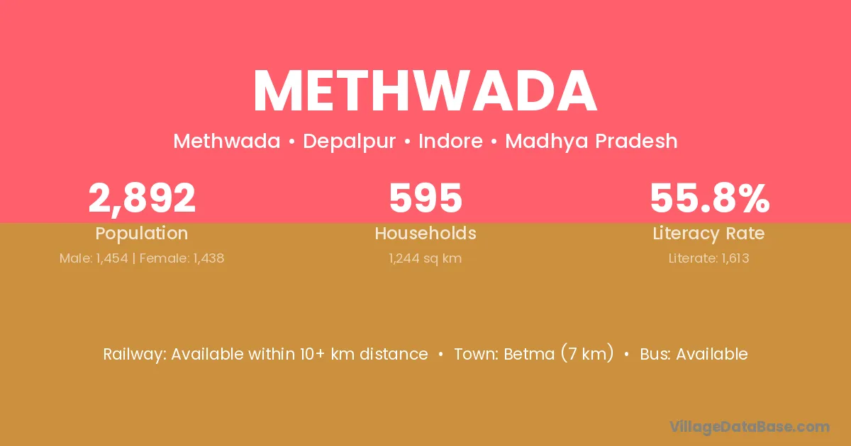Betma (7 km) is the nearest town to Methwada village for major economic activities and is located approximately 7 km away.