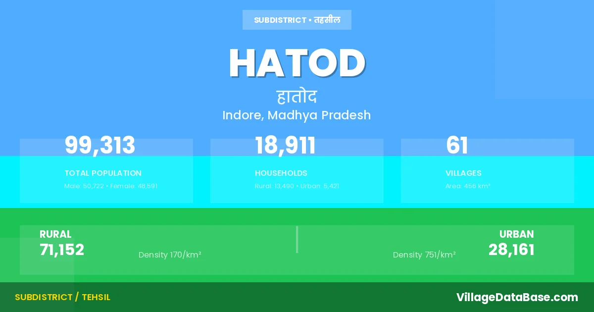 According to the 2011 census The total area of Hatod Tehsil is 456 km², with a population of 99313 people. The population density is 218 inhabitants per square kilometre, and there are approximately 18911 houses in the sub district.