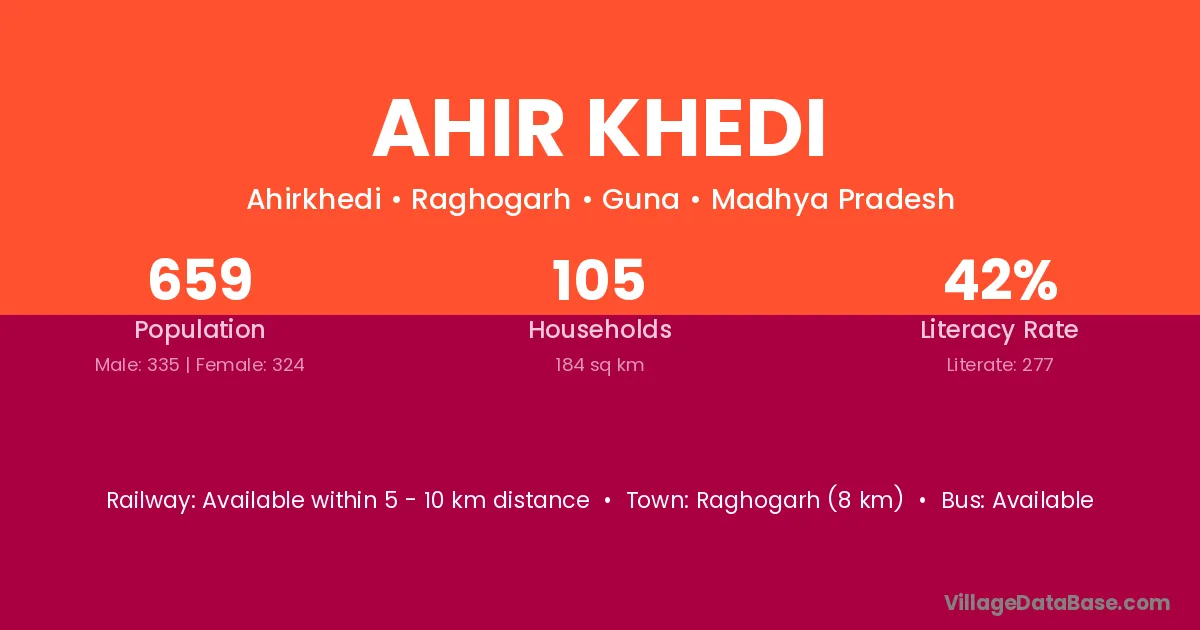 The literacy rate of Ahir Khedi village is 68.95%. Male literacy stands at 81.11% and female literacy at 55.65%.