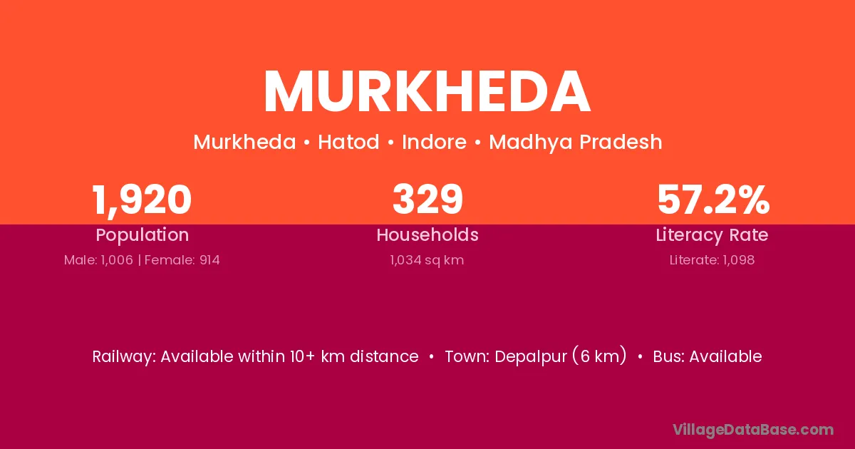 Murkheda village has a total population of 1,920 people, of which 1,006 are males and 914 are females.