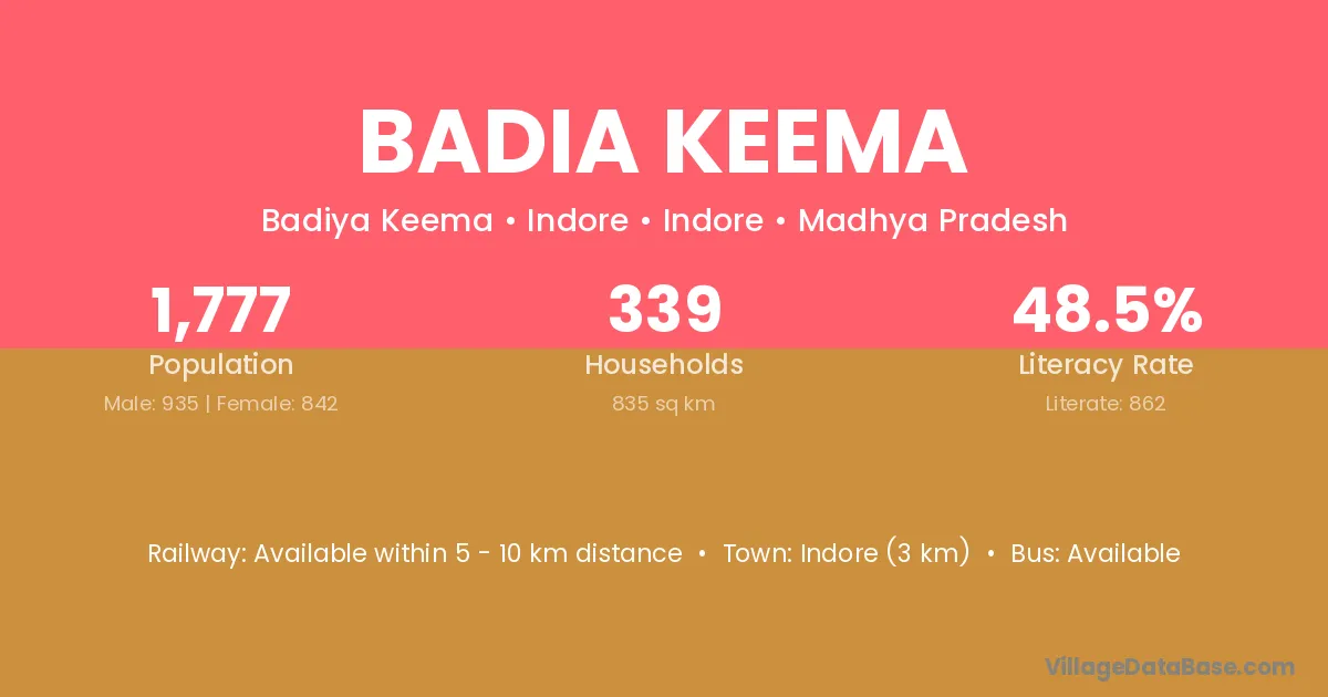 Indore (3 km) is the nearest town to Badia Keema village for major economic activities and is located approximately 3 km away.