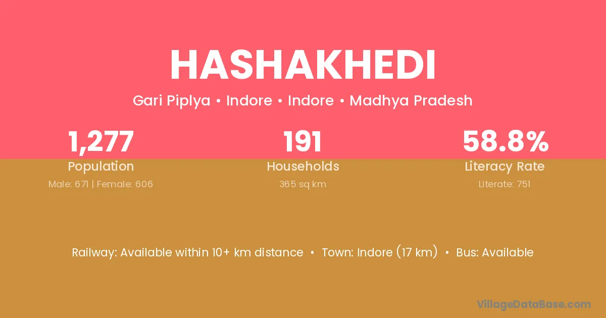 Indore (17 km) is the nearest town to Hashakhedi village for major economic activities and is located approximately 17 km away.