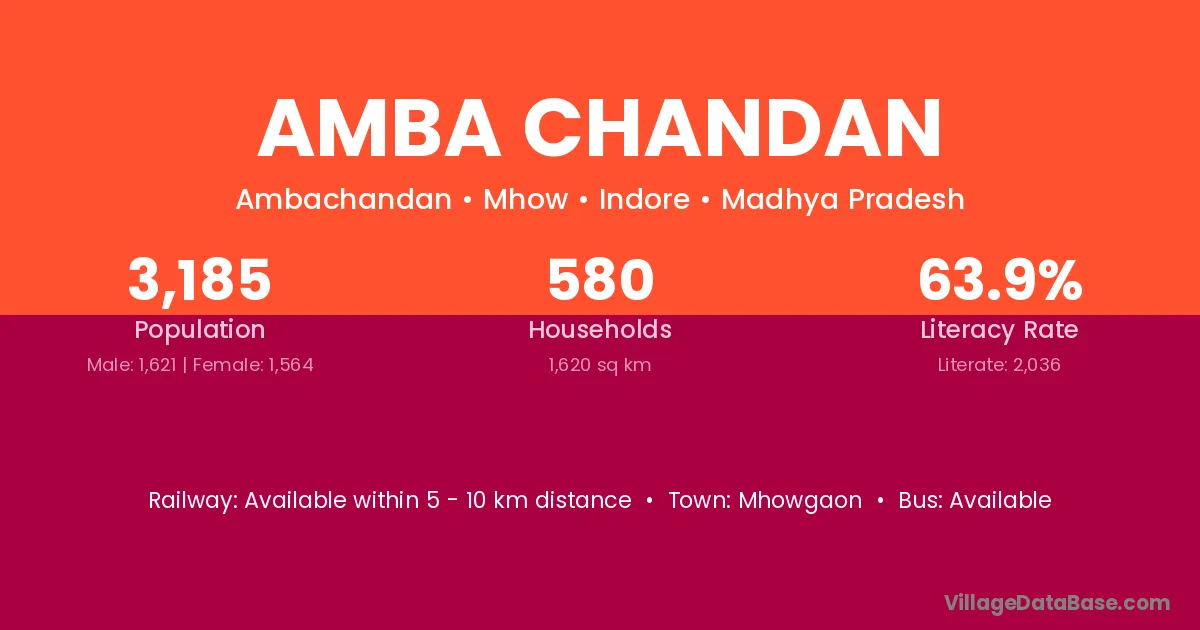 Amba Chandan village has a total population of 3,185 people, of which 1,621 are males and 1,564 are females.