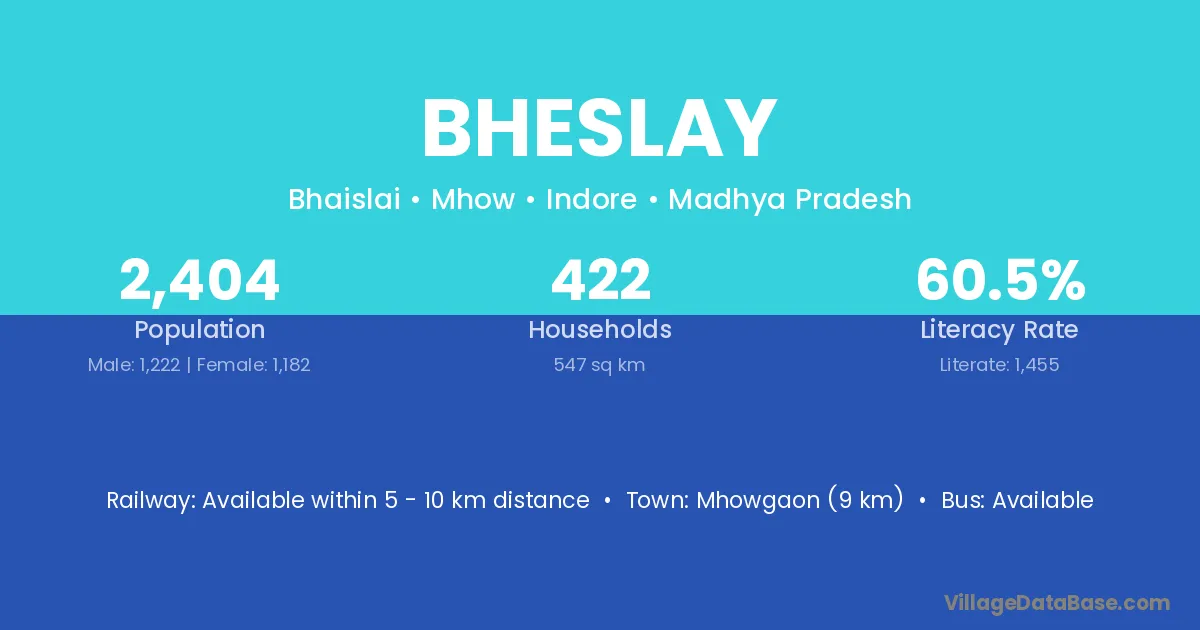 Mhowgaon (9 km) is the nearest town to Bheslay village for major economic activities and is located approximately 9 km away.