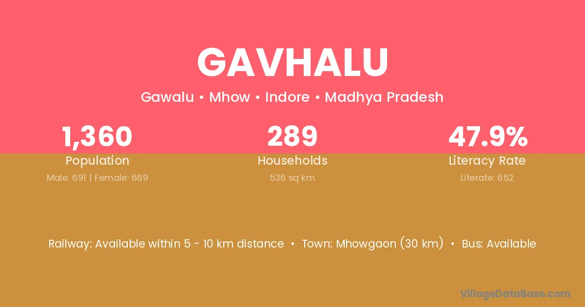 Mhowgaon (30 km) is the nearest town to Gavhalu village for major economic activities and is located approximately 30 km away.