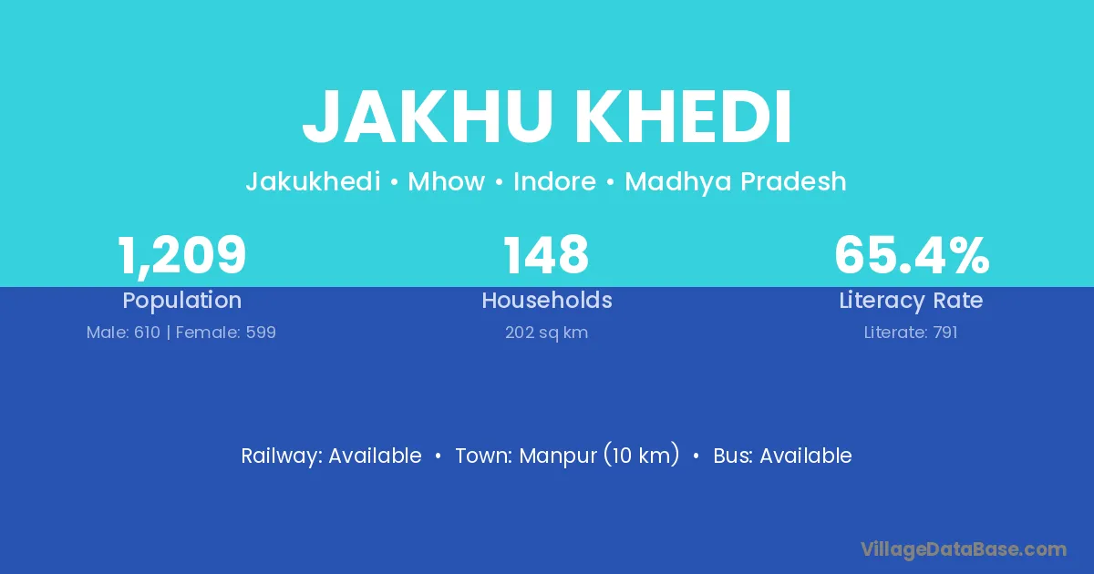 Jakhu Khedi village has a total population of 1,209 people, of which 610 are males and 599 are females.