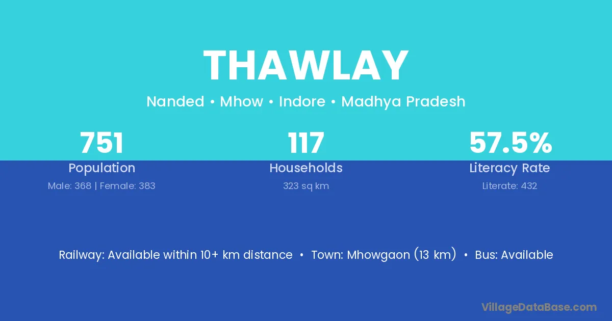 Mhowgaon (13 km) is the nearest town to Thawlay village for major economic activities and is located approximately 13 km away.