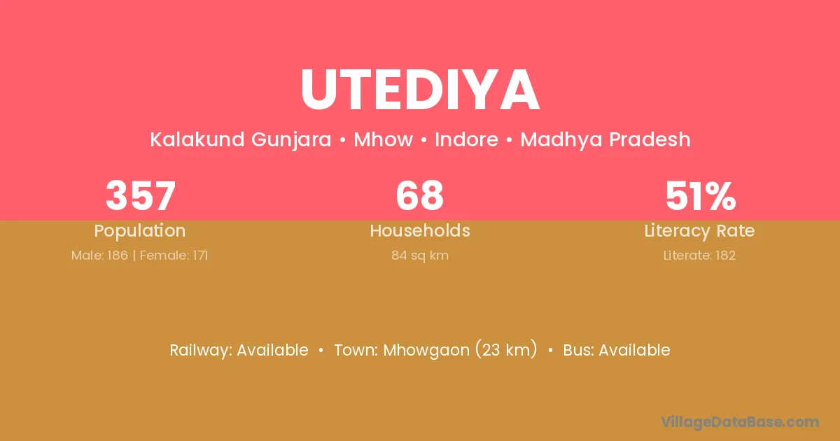 Utediya village has a total population of 357 people, of which 186 are males and 171 are females.