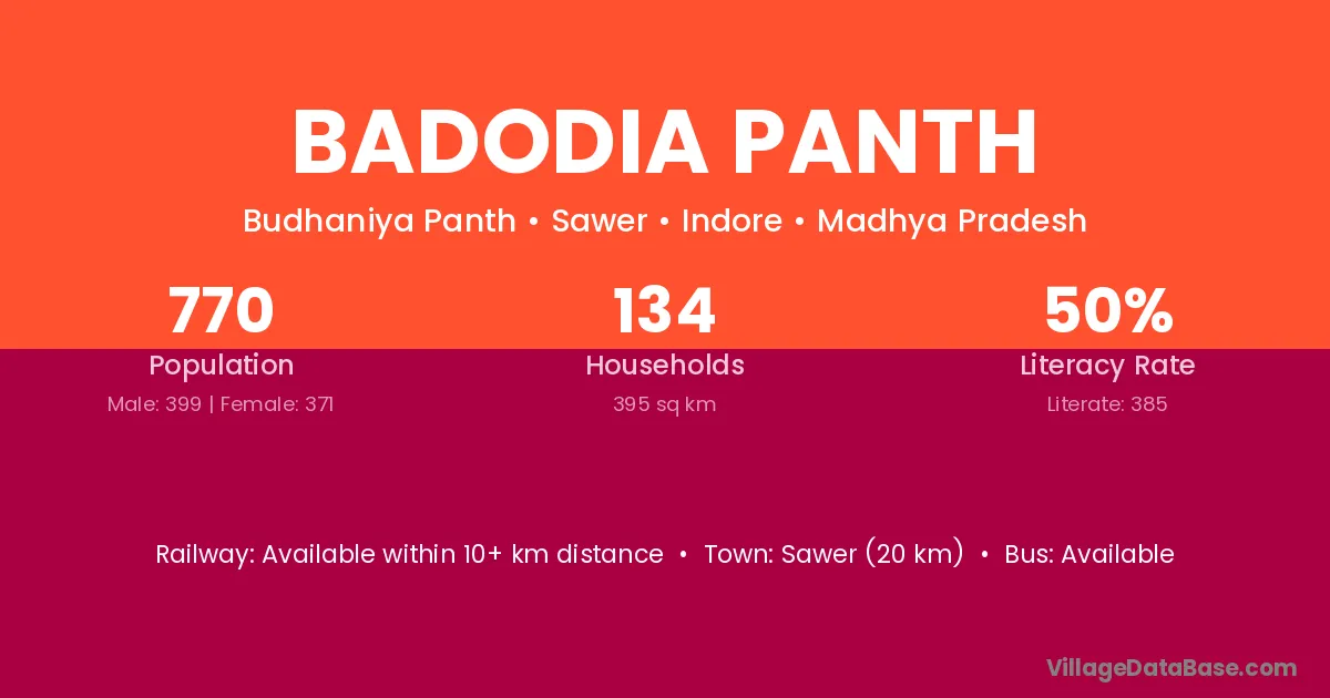 Sawer (20 km) is the nearest town to Badodia Panth village for major economic activities and is located approximately 20 km away.