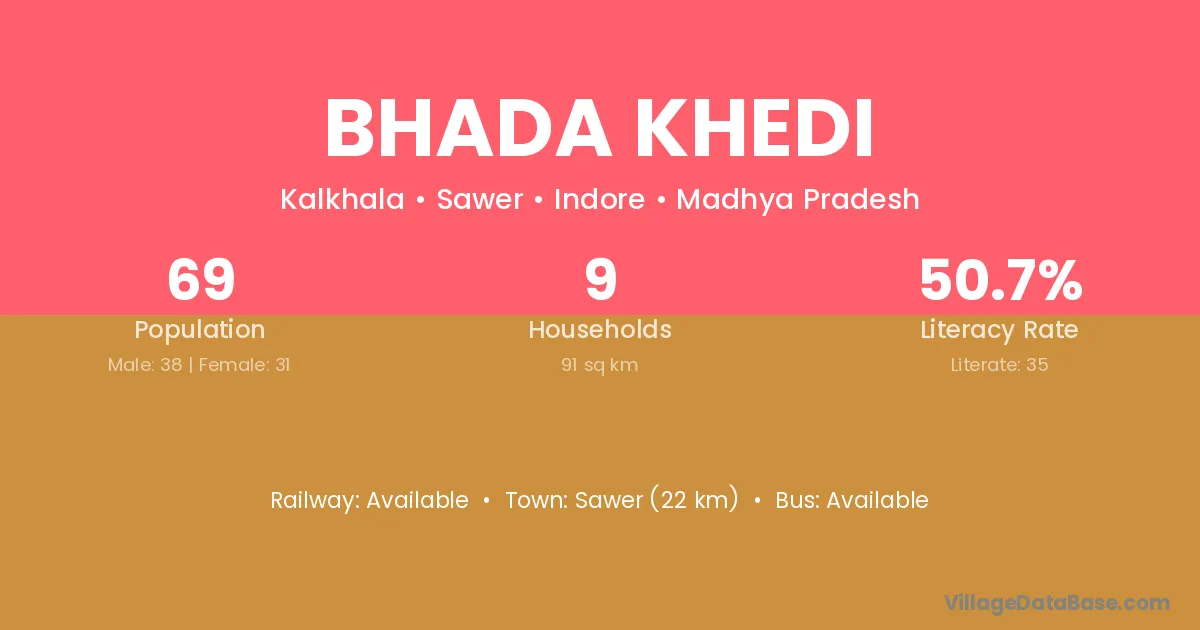 Bhada Khedi village has a total population of 69 people, of which 38 are males and 31 are females.