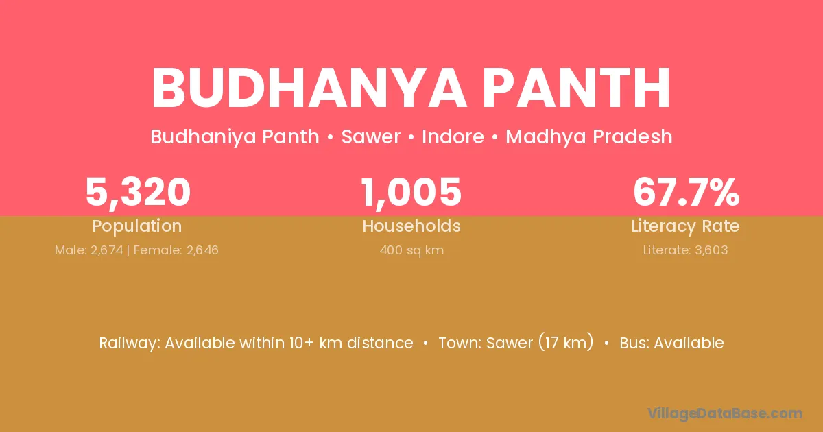 Sawer (17 km) is the nearest town to Budhanya Panth village for major economic activities and is located approximately 17 km away.