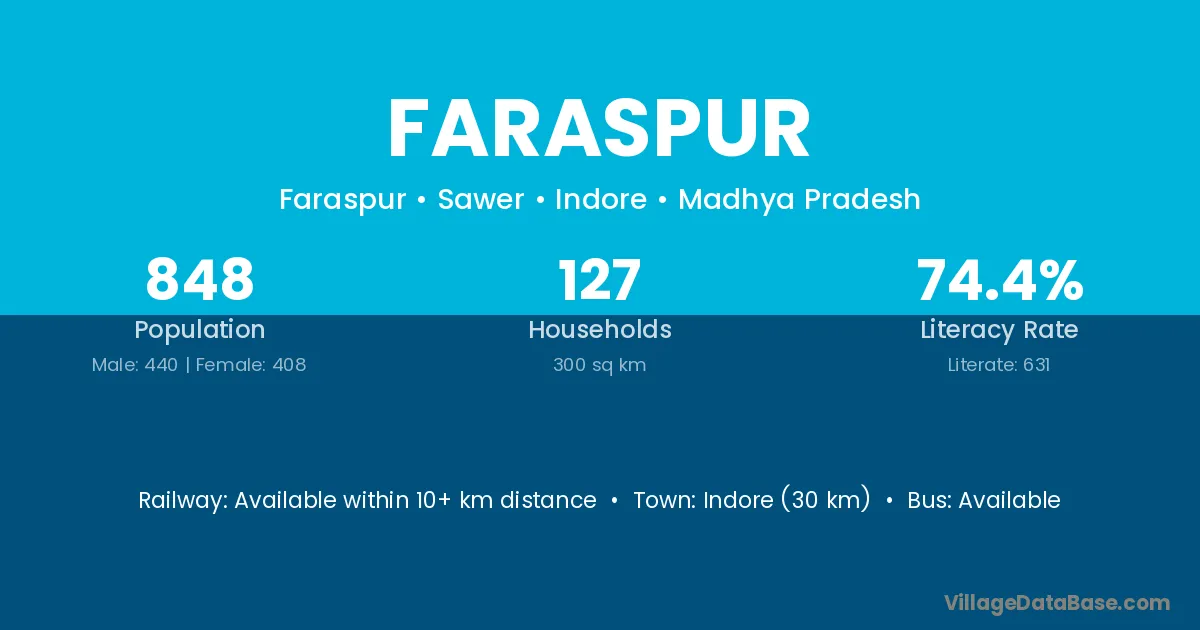 Indore (30 km) is the nearest town to Faraspur village for major economic activities and is located approximately 30 km away.