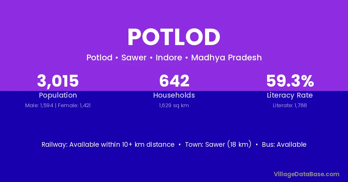 Sawer (18 km) is the nearest town to Potlod village for major economic activities and is located approximately 18 km away.