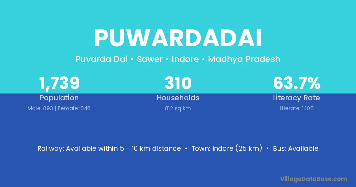 Indore (25 km) is the nearest town to Puwardadai village for major economic activities and is located approximately 25 km away.