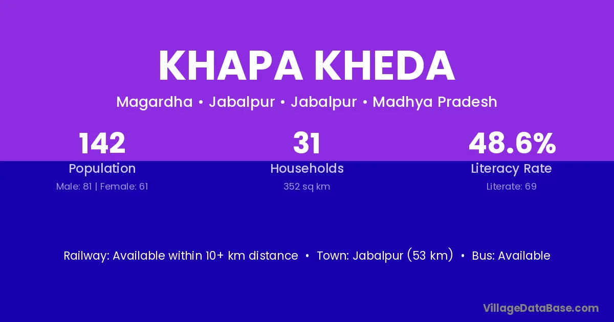 Jabalpur (53 km) is the nearest town to Khapa Kheda village for major economic activities and is located approximately 53 km away.