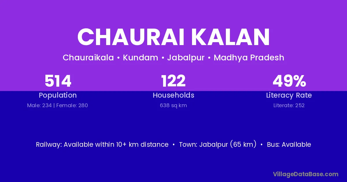 Jabalpur (65 km) is the nearest town to Chaurai Kalan village for major economic activities and is located approximately 65 km away.