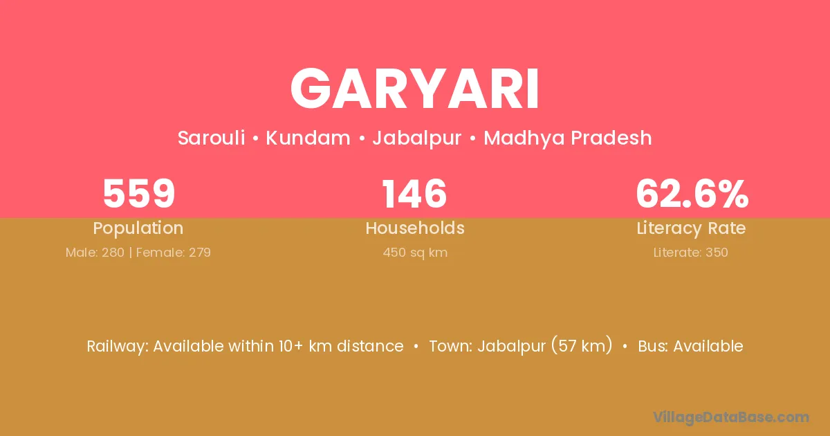 Jabalpur (57 km) is the nearest town to Garyari village for major economic activities and is located approximately 57 km away.