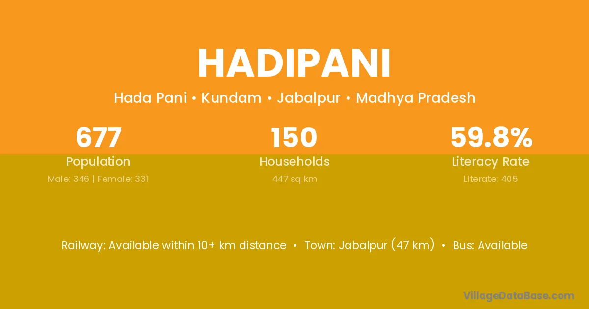 Jabalpur (47 km) is the nearest town to Hadipani village for major economic activities and is located approximately 47 km away.