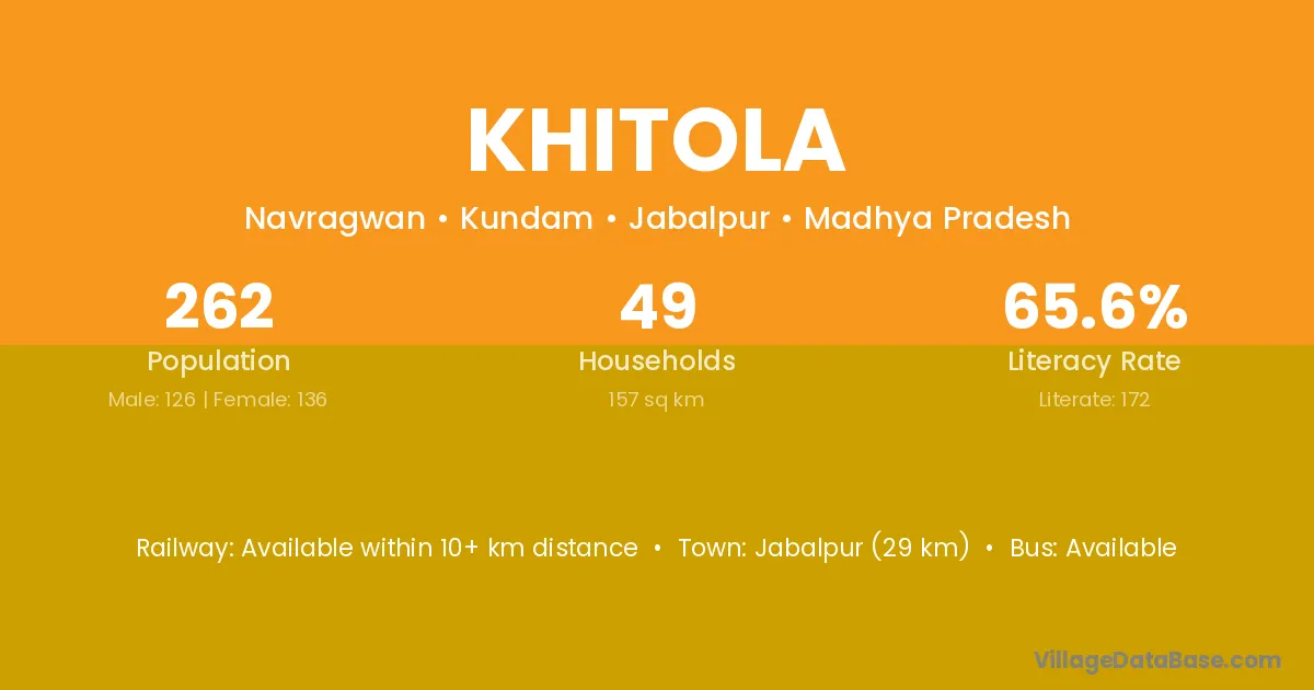 Jabalpur (29 km) is the nearest town to Khitola village for major economic activities and is located approximately 29 km away.